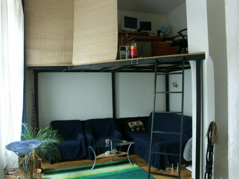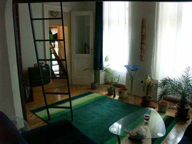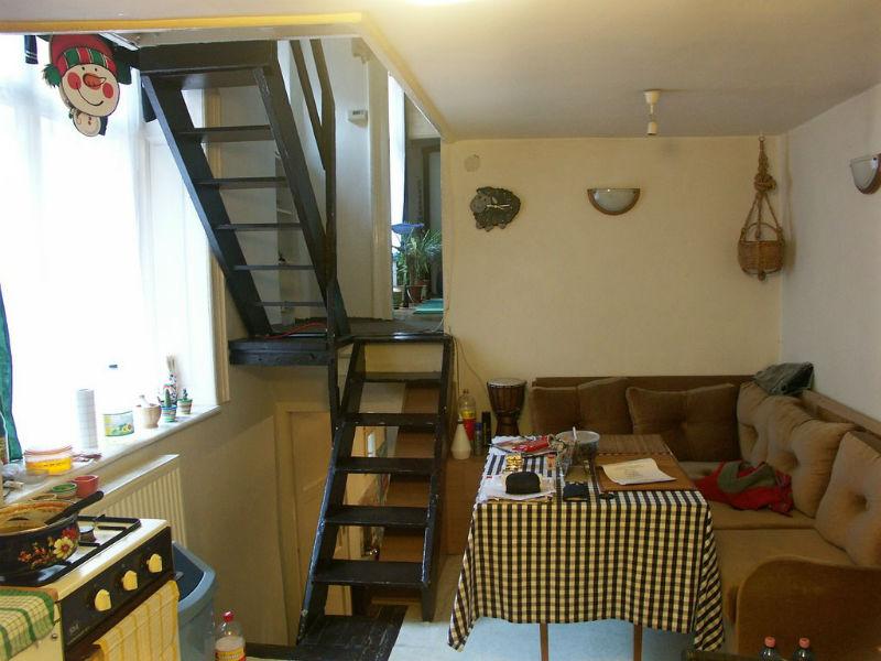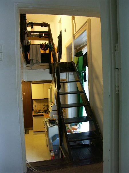 Belső 4 szintes. A közlekedést segíti kaz igényes és kreatív lépcsők, és mint látható, a lakás sok pontján lehet teregetni. A kis fészek lelke a lakás második szintjén található konyha, és a hozzá tartozó plüss sarokgarnitúra.