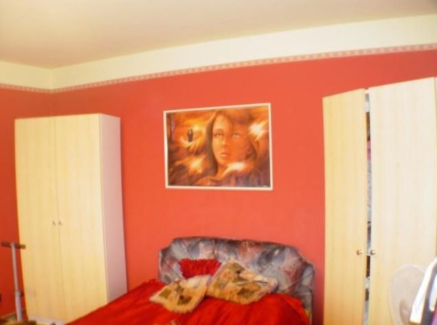 a hallban B. Banga Béla: Vaginális disztorciók 1., a hálószobában Egyik János: Szikrák a szélben című műve látható.