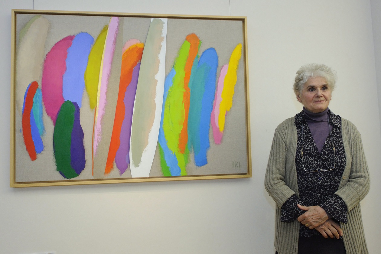 Az életműdíjjal kitüntetett Keserü Ilona Színváltó hangtestek című festménye mellett a Magyar Festészet Napja alkalmából a szegedi Reök-palotában rendezett Doyenek és fiatalok című kiállítás megnyitóján (Fotó: Kelemen Zoltán Gergely / MTI)