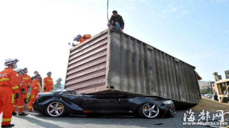 Audi és konténer szokatlan találkozása. És ami a legerősebb, hogy a Shanghaiist tudosítása szerint az autó két utasa kisebb sérülésekkel megúszta az esetet. Mondjuk autót azt valószínűleg vehetnek újat. (via Jalopnik)