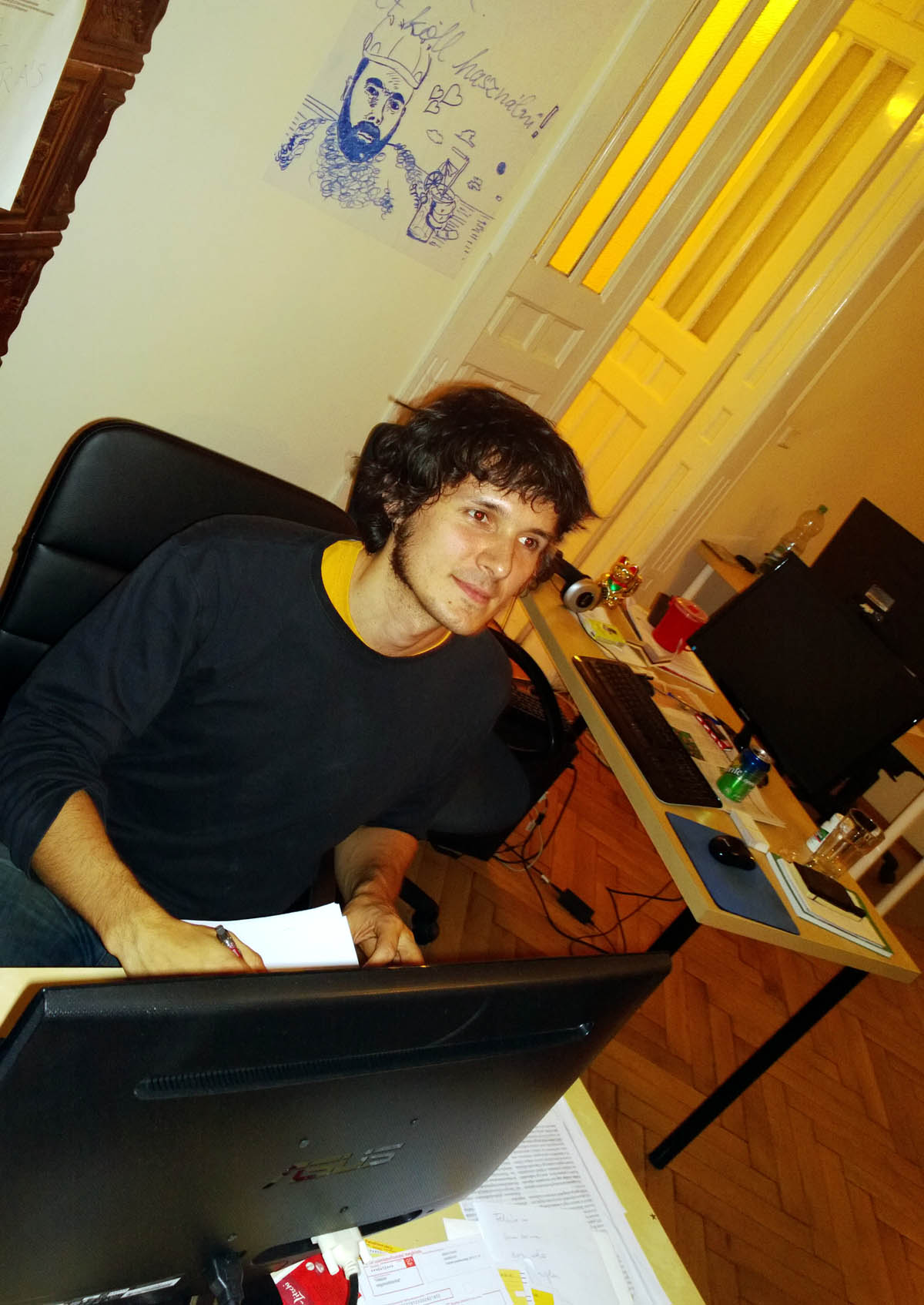 Plankó Gergely újságíró feszült figyelemmel jegyzetel. Uj Péter főszerkesztő személyes fényképfölvétele, minden jog fönntartva
