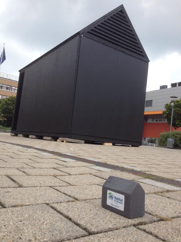 Az Örs vezér téren állított fel reggel egy fekete házat a Habitat for Humanity Magyarország, amit három nap alatt fehér téglákra írt gyermekálmokkal borítanak be.