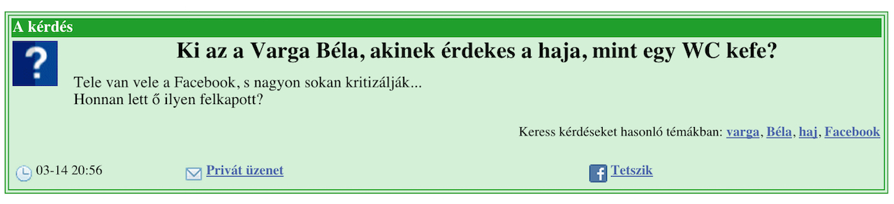 A haj, ami már tökéletesen függetlenítette magát gazdájától. Varga Béla egy átlagos 16 éves tapolcai iskolás fiú. A személye tulajdonképpen lényegtelen. Viszont amit a fején visel, arról sok száz tinédzsernek markáns véleménye van. Ha létezik megosztó haj, akkor Varga Béláé biztosan az.