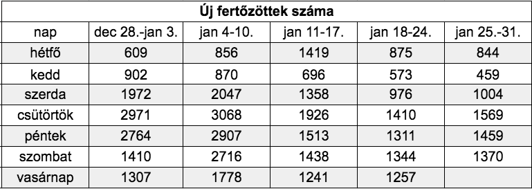 A tesztelés sajátosságai miatt az új fertőzöttek számánál nemcsak azt érdemes figyelni, hogy egyik napról a másikra hogyan alakul az új fertőzöttek száma, mert óriási hullámzások vannak. A hétvégén kevesebb tesztet végeznek, ezeknek az eredménye csak a hét elején van meg, ezért hétfőn-kedden mindig alacsonyabb a regisztrált új fertőzöttek száma, a hét második felében magasabb. Ezért hasznos, ha napokat hasonlítunk az előző hét ugyanazon napjaival. Ha ezt nézzük, kis emelkedés látszik a számokban negyedik napja.