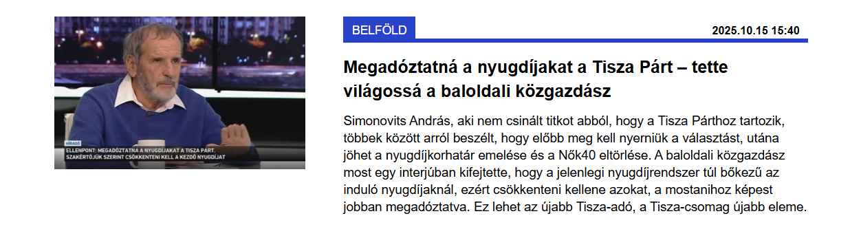 Miután a Fidesz és a kormánypropaganda Simonovitsra a Tisza szakértőjeként vagy Tisza-közeli közgazdászként hivatkozik (erre még visszatérünk), az egészből az lett, hogy a Tisza megadóztatná a nyugdíjakat. Orbán Viktor egyébként nem állt bele direktben a megadóztatásba, ő nyugdíjcsökkentésről beszél. A Világgazdaság végig is számolta, hogy egy 20 százalékos adó kinek mit jelentene, a táblázatot pedig a Híradóban is bemutatták.