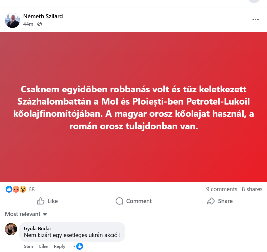 A létesítmény sérüléseinek mértékéről egyelőre a MOL nem közölt érdemi információkat, csak azt jelezték, hogy nincs semmilyen arra utaló jel, hogy külső beavatkozás történt volna. Ezzel azokat a Fidesz-megmondóemberek által is gyorsan terjeszteni kezdett ukránozó konteókat is cáfolták, hogy összefüggés lenne a százhalombattai tűz és a romániai Ploiestiben lévő Lukoil-finomítóban történt hétfői kisebb baleset, vagyis az orosz olajiparhoz így vagy úgy, de kapcsolódó létesítmények problémái között.