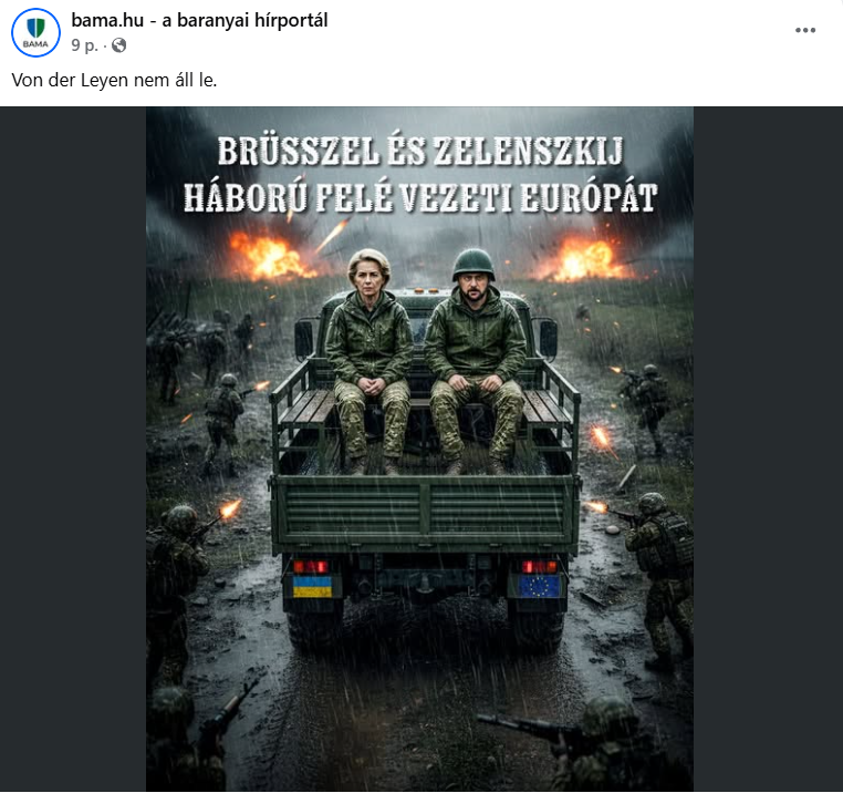 A Magyar Pétert láncos kutyaként ábrázoló képsorozat után újabb összehangolt AI-akciót hajtottak végre a megyei lapoknál, az összes kiadvány Facebook-oldalán megjelent ugyanaz a tartalmú kép: Volodomir Zelenszkij és Ursula von der Leyen ül egy katonai teherautón. A háttér néhol változik, ahogy a kísérőszövegben is vannak eltérések, de mutatunk egy példát: