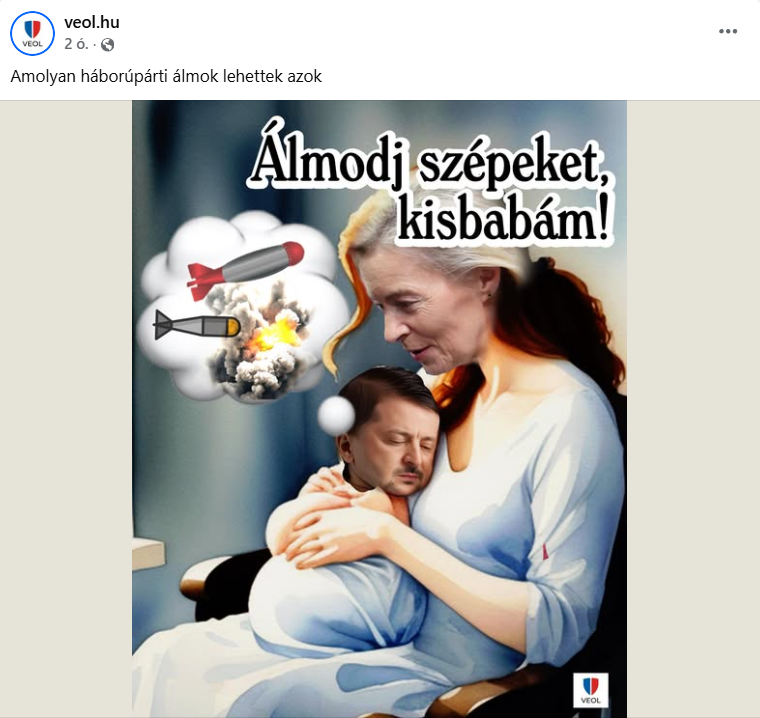 Ehhez a képhez egyik oldalon sem kötöttek cikket. Öt megyei lap ennél is tovább ment: a Kisalföld, a Feol (Fejér megyei hírportál), a Kemma (Komárom-Esztergom megyei hírportál), a Vaol (Vas megyei hírportál) és a Veol (Veszprém megyei hírportál) oldalán kitettek egy AI-generálta képet, amely az ukrán elnököt rakétákról álmodó kisgyerekként ábrázolja. Volt, ahol a bizottság elnökét az anyjaként ábrázolták. A körítés itt is változott.
