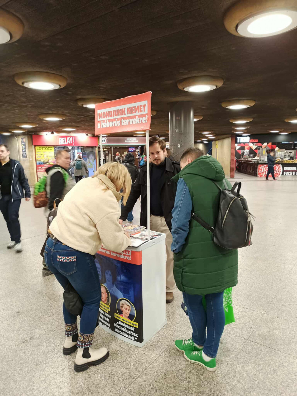 A fotó ezen a standoláson készült, ahol a háború ellen gyűjtenek aláírásokat a Fidesz ifjúsági szervezetének a tagjai. Összeérnek időben, de ez nem a nemzeti konzultáció a Tisza-adó ellen, hanem a Fidesz által indított aláírásgyűjtés.