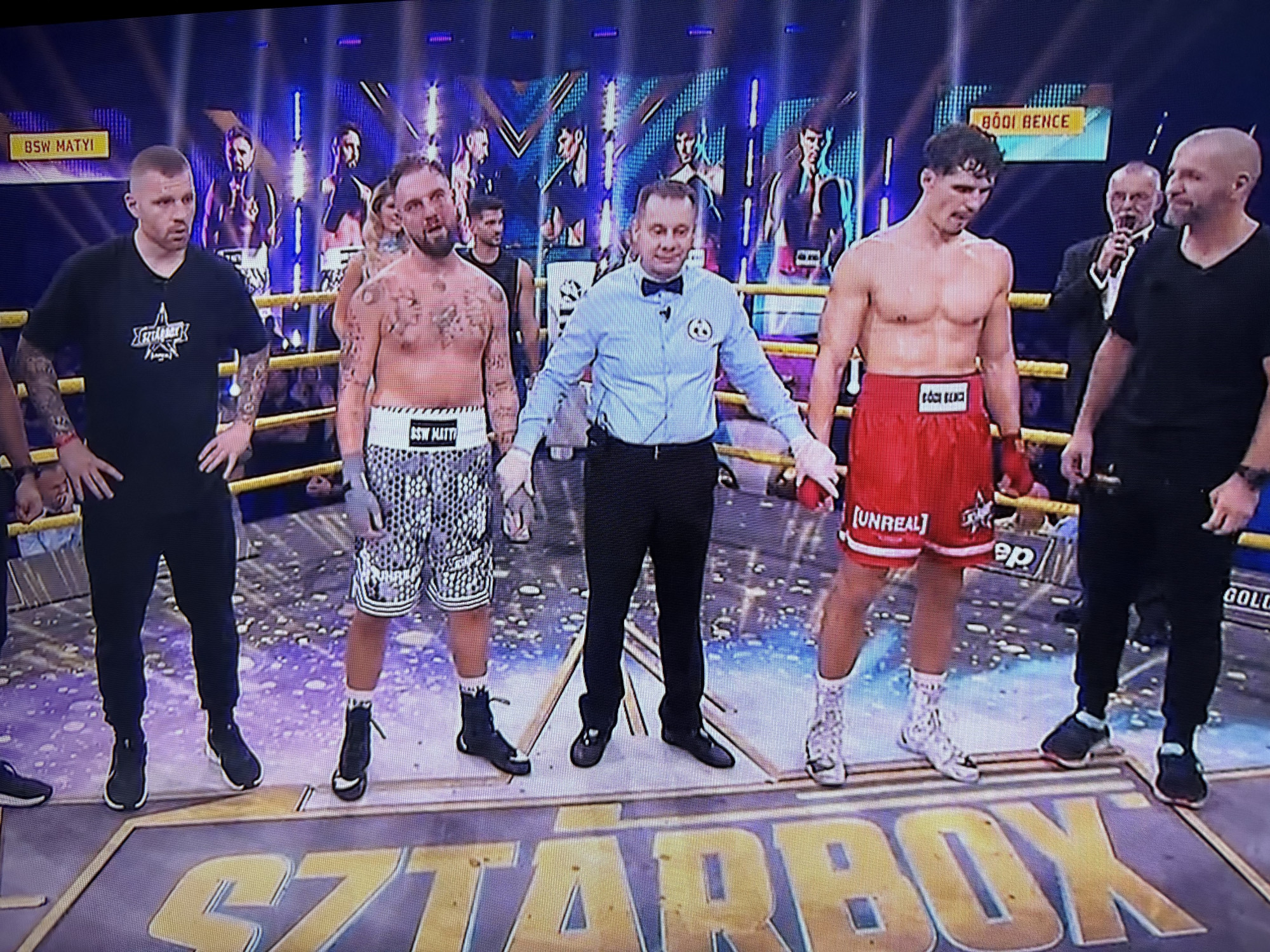 Az sajnos nem derült ki, hogy az író kinek drukkolt az első mérkőzés alatt, Gáspár Evelinnek vagy Kulcsár Edinának. Azt azonban megtudhattuk, hogy Gáspár Evelin szerint ez az öv neki jár. A kétmillió alkoholbeteg országában ezután arra kérte a nézőket, hogy igyanak meg a kedvéért egy pálinkát, mire a műsorvezető Ember Márk is azt mondta a kamerának: „Reméljük, önök is isznak!”
