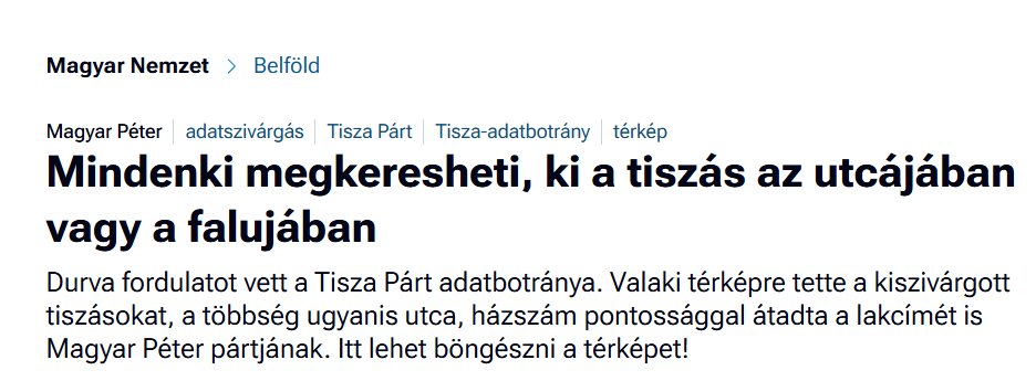A lapban ezután arról írnak, hogy „most minden tiszás a saját bőrén tapasztalhatja, hogy mit is jelent valójában a Tisza adatbotránya”, és „mostantól bárki megtudhatja, hogy hol él az a mintegy 200 ezer ember, akinek az adatai nyilvánosságra kerültek Magyar Péterék felelőtlen hozzáállása miatt.”