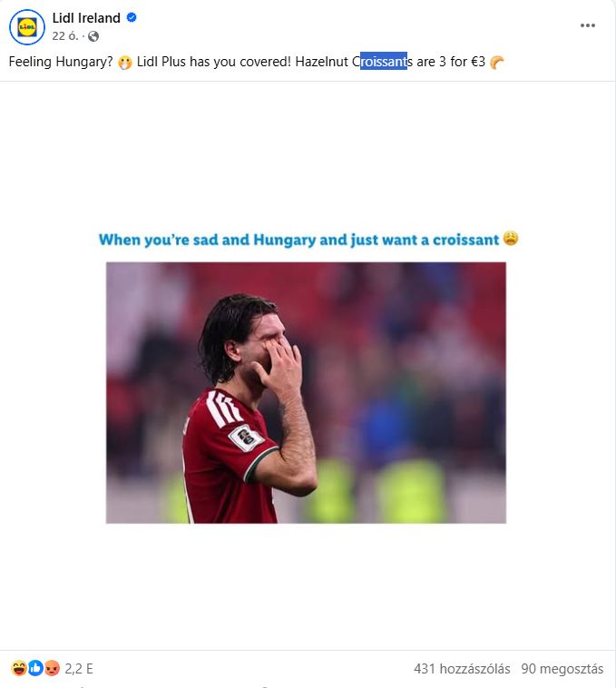Feeling Hungary? – sütik el ezt a remek poént a síró Szoboszlai képe mellett, majd a mogyorókrémes croissant-jukat promózzák.