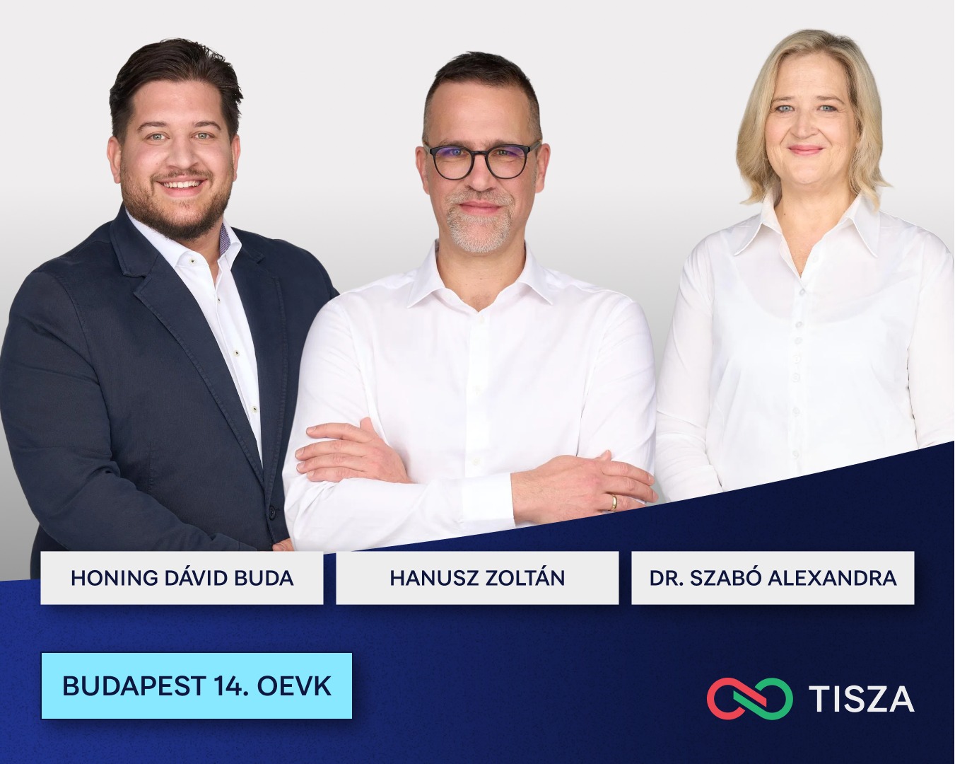 Budapest 14-es körzetének három jelöltje: Hanusz Zoltán informatikus, aki dolgozott az Audinál, a Thyssenkruppnál és az SKF-nél is, Honing Dávid Buda vállalkozó, olimpiai karateversenyző, és Dr. Szabó Alexandra orvos, klinikai gyógyszerkutatási projektmenedzser.