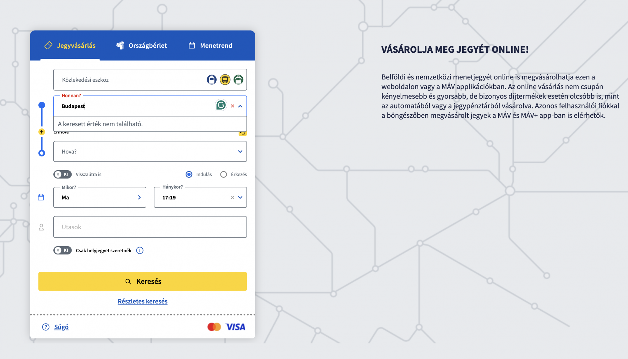 A honlapon történő jegyvásárláskor már ott elvérzik a történet, hogy hiába próbáljuk megadni, hogy honnan hova szeretnénk utazni, nem dob ki keresési találatot a rendszer, így viszont nem lehet továbblépni.