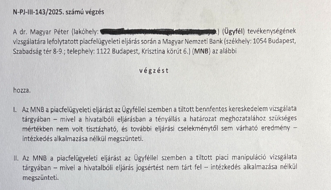 A nemzeti bank most lezárult vizsgálata viszont Magyart nem marasztalta el sem bennfentes kereskedelem, sem piaci manipuláció miatt, igaz, a két pontban más és más indokkal zárta le intézkedés nélkül az eljárást. Az MNB erről szóló határozatának egy oldalát a Tisza párt sajtóközleményként is elküldte Magyar Péternek azzal a megjegyzésével, hogy „a Magyar Nemzeti Bank tegnap intézkedés alkalmazása nélkül megszüntette a bennfentes kereskedelem és tiltott piaci manipuláció miatt ellenem indított mindkét eljárást. Az egyiket jogsértés hiányában, a másikat azért, mert hónapokig nem volt képes felderíteni a tényállást”. Magyar szerint az MNB döntése jelzi, hogy Varga Mihály jegybankelnökként nem hajlandó behódolni Orbánnak, illetve azt jelenti, hogy „Orbán Viktor, valamint a fideszes bűntársai és propagandistái hónapokig hazudoztak a magyar embereknek és minden alap nélkül vádoltak bűncselekmények elkövetésével”.