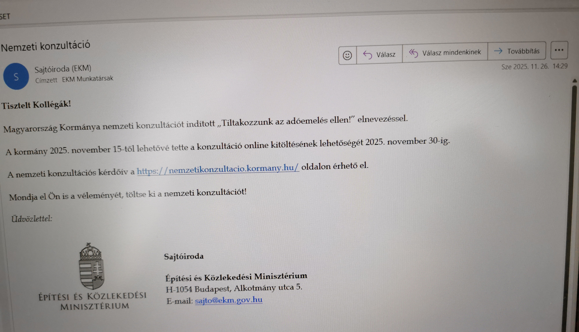 Az Építési és Közlekedési Minisztérium (ÉKM) sajtóirodája szerdán küldött körlevelet a minisztériumi dolgozóknak. Emlékeztették a munkatársakat, hogy a kormány november 15-től lehetővé tette a nemzeti konzultáció online kitöltését november 30-ig. Azt kérték a dolgozóktól, hogy mondják el véleményüket, töltsék ki a konzultációt.