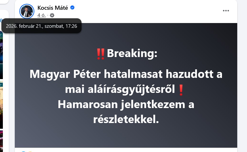 Kocsis Máté, mint azt bizonyára mindenki tudja, a Fidesz frakcióvezetője. Nos, tehát, a Magyar Péterbe mindig előszeretettel beleálló Kocsis szombaton 17 óra 26 perckor, tehát bő fél órával Szánthó Miklós leleplező posztja előtt a következőt publikálta Facebookon: