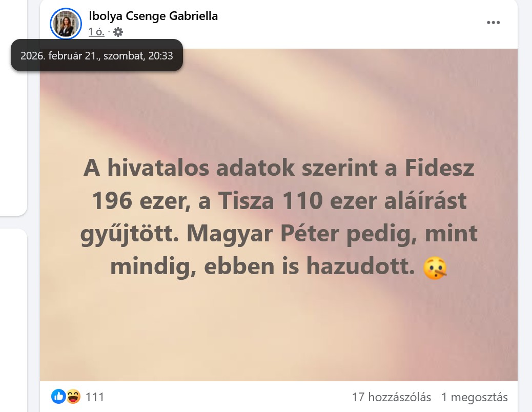 Bejegyzésében többek közt azt írta, hogy az Alapjogokért Központ közérdekű adatigényléssel fordult a Nemzet Választási Irodához (NVI), a következtetése pedig az lett, hogy a hivatalos adatok szerint „Magyar Péter biztosan hazudott a Tisza jelöltjei által gyűjtött aláírások számáról”.