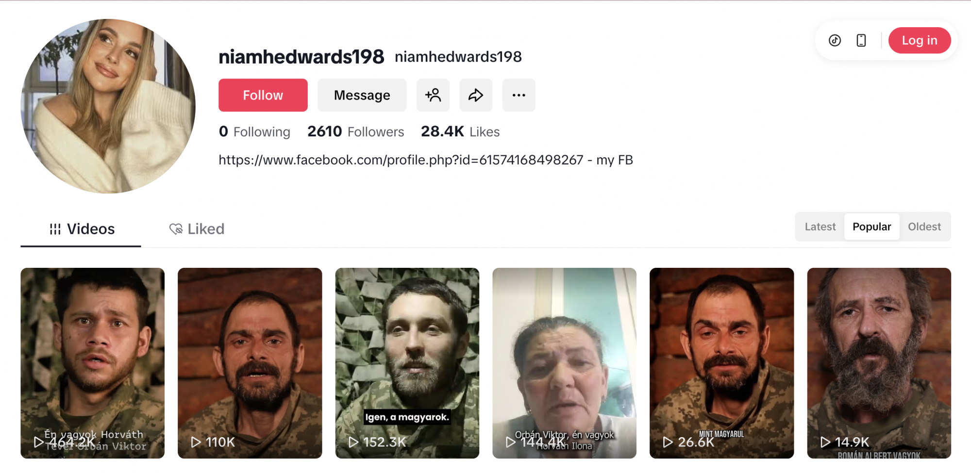 Az egyik, orosz fogságban lévő kárpátaljai férfiról készült videó például a Facebookon már tavaly karácsonykor megjelent, míg a TikTokra csak január végén került fel, ott azonban több mint 450 ezres megtekintést ért el. A meglehetősen hanyagul feliratozott felvételen egy Horváth Emil nevű, 26 éves férfi beszél, aki egy ponton - nehezen értelmezhető kontextusban - Orbán Viktor nevét is megemlíti.