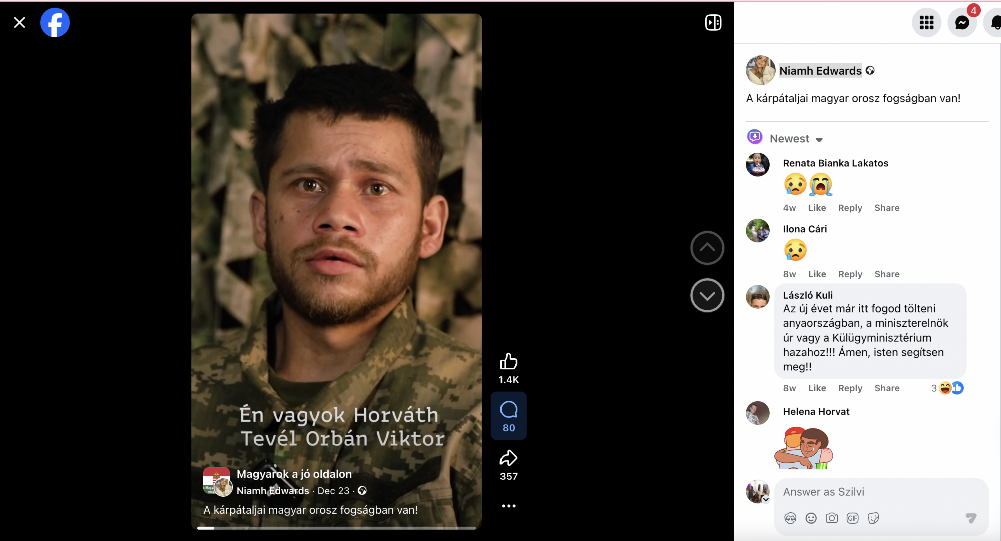 „Én magyar vagyok. És én úgy akarnám, hogy Orbán Viktor megállítná a háborút. Mert sok magyarok vannak itt Ukrajnán. És akkor visznek háborúba, lökik befele őket, minden embert, aki nem tud ukránul, lökik befele őket be kocsiba és hozni el háborúzni. […] azt akarnám, Orbán Viktor, beszéljenek Putyinnal, hogy akit itten megfognak, Oroszország, hogy adják át Magyarországnak őket. Mi magyarok vagyunk, nem akarunk semmi problémát senkinek."