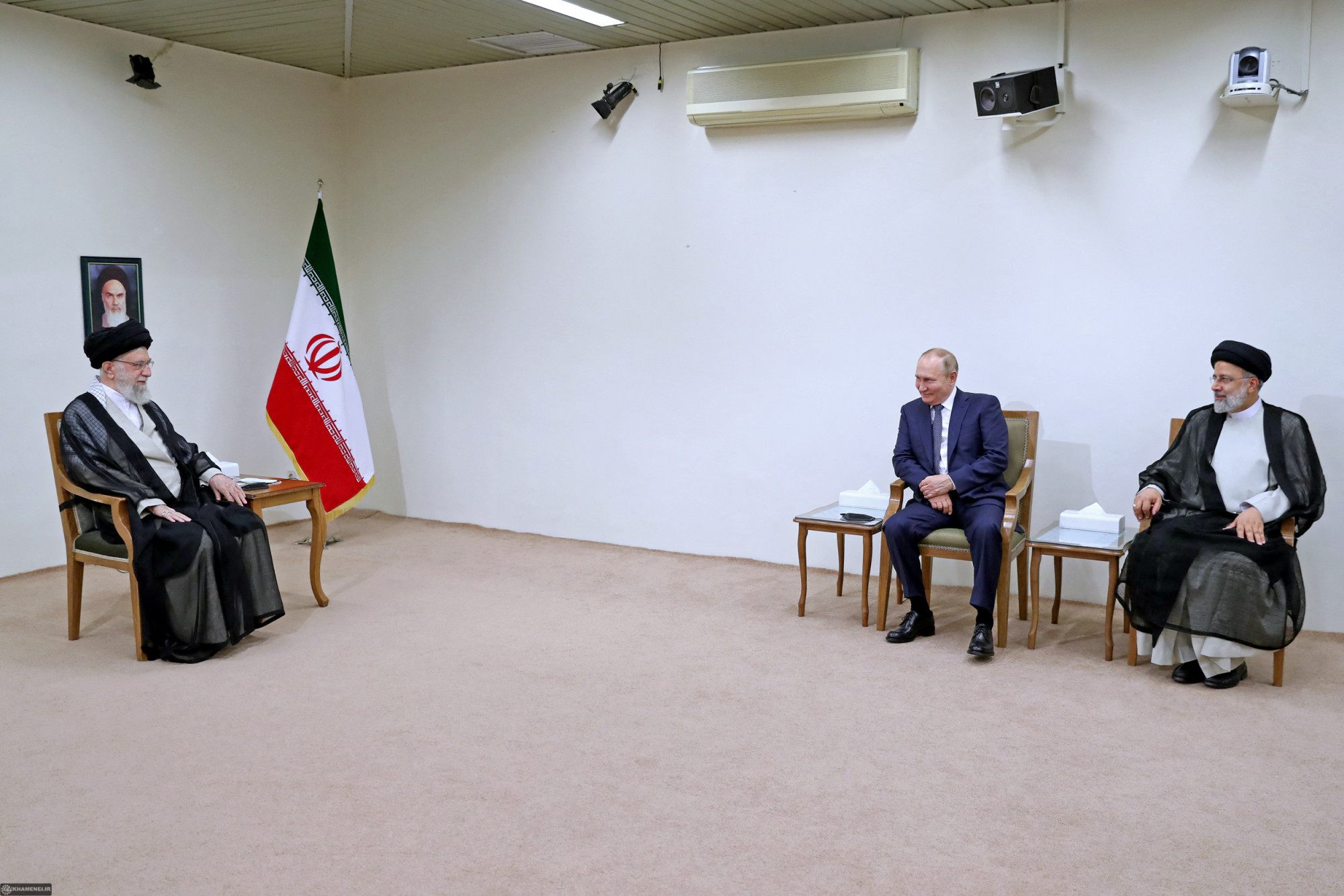 Az iráni legfelsőbb vezető, Ali Hamenei ajatollah irodája által kiadott képen (balra) Hamenei fogadja Vlagyimir Putyin orosz elnököt iráni hivatali partnerének, Ebrahim Raiszi jelenlétében Teheránban, 2022. július 19-én.