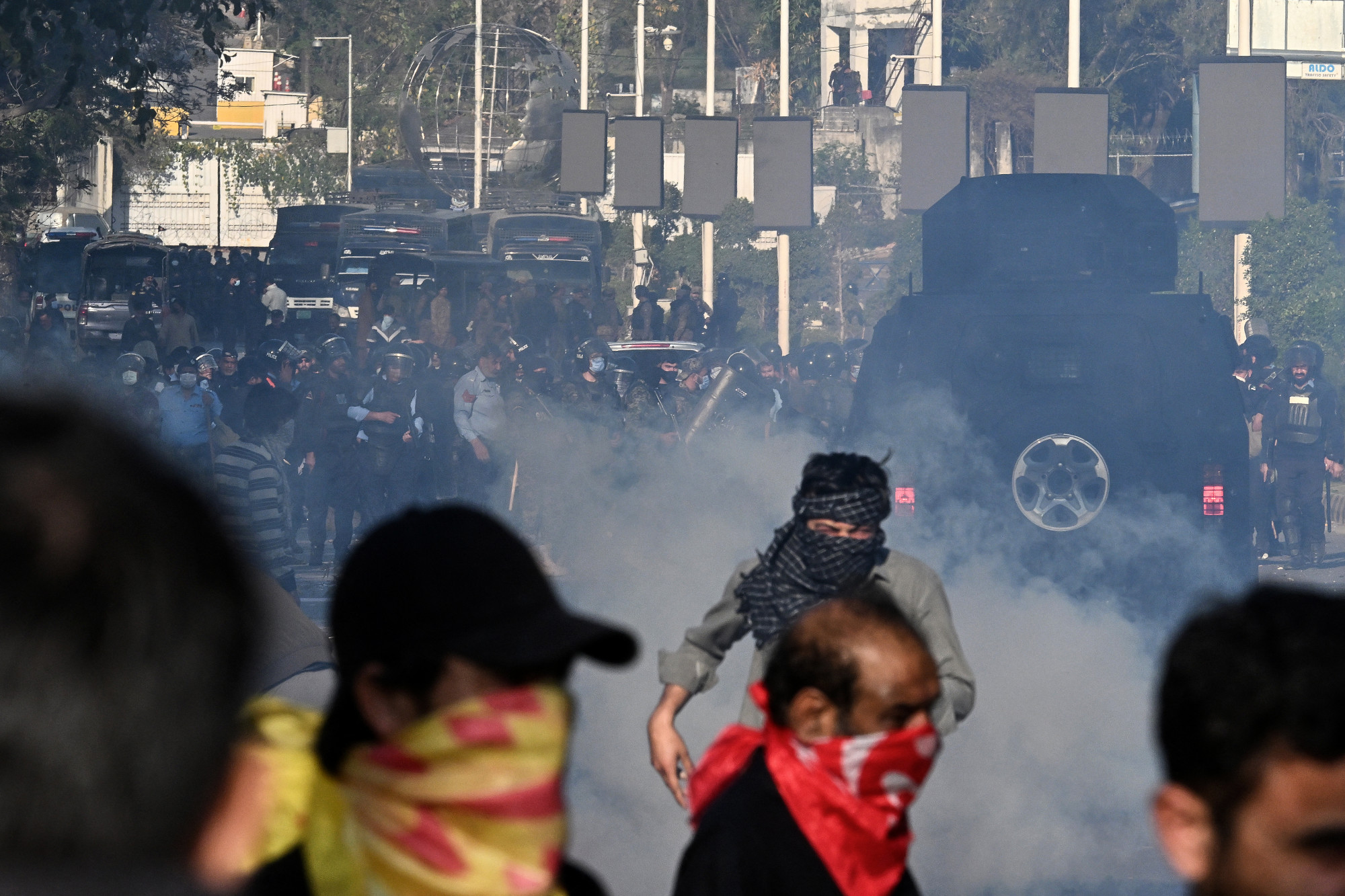 Rohamrendőrök könnygázgránátokat vetettek be síita muszlimokkal szemben, miután a tömeg megpróbálta megrohamozni az amerikai nagykövetséget Iszlámábádban 2026. március 1-jén.