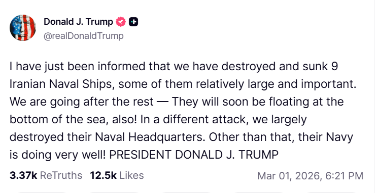 Donald Trump amerikai elnök nemrég a Truth Social közösségi oldalon közzétett bejegyzésében azt állította, hogy az Egyesült Államok kilenc iráni hadihajót „megsemmisített és elsüllyesztett”.