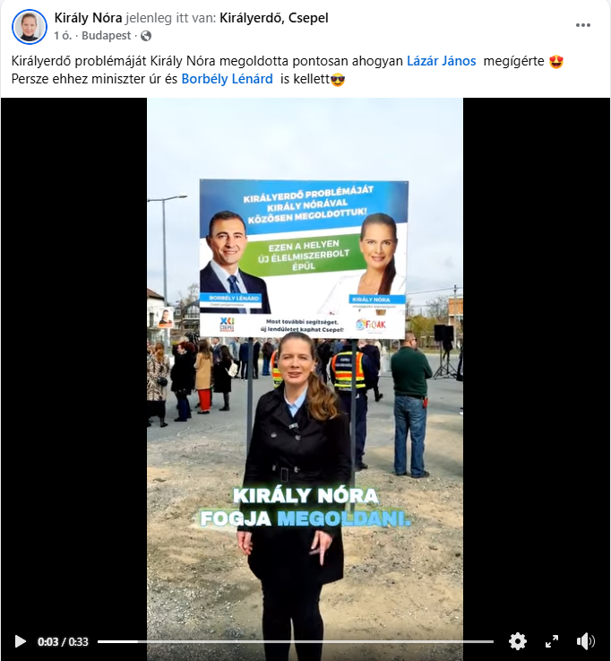 Király Nóra is ott termett a bolt alapkövének letételén, nem is akárhogy. Videójában Lázár János minisztert idézte, aki szerint Királyerdő problémáját Király Nóra fogja megoldani.