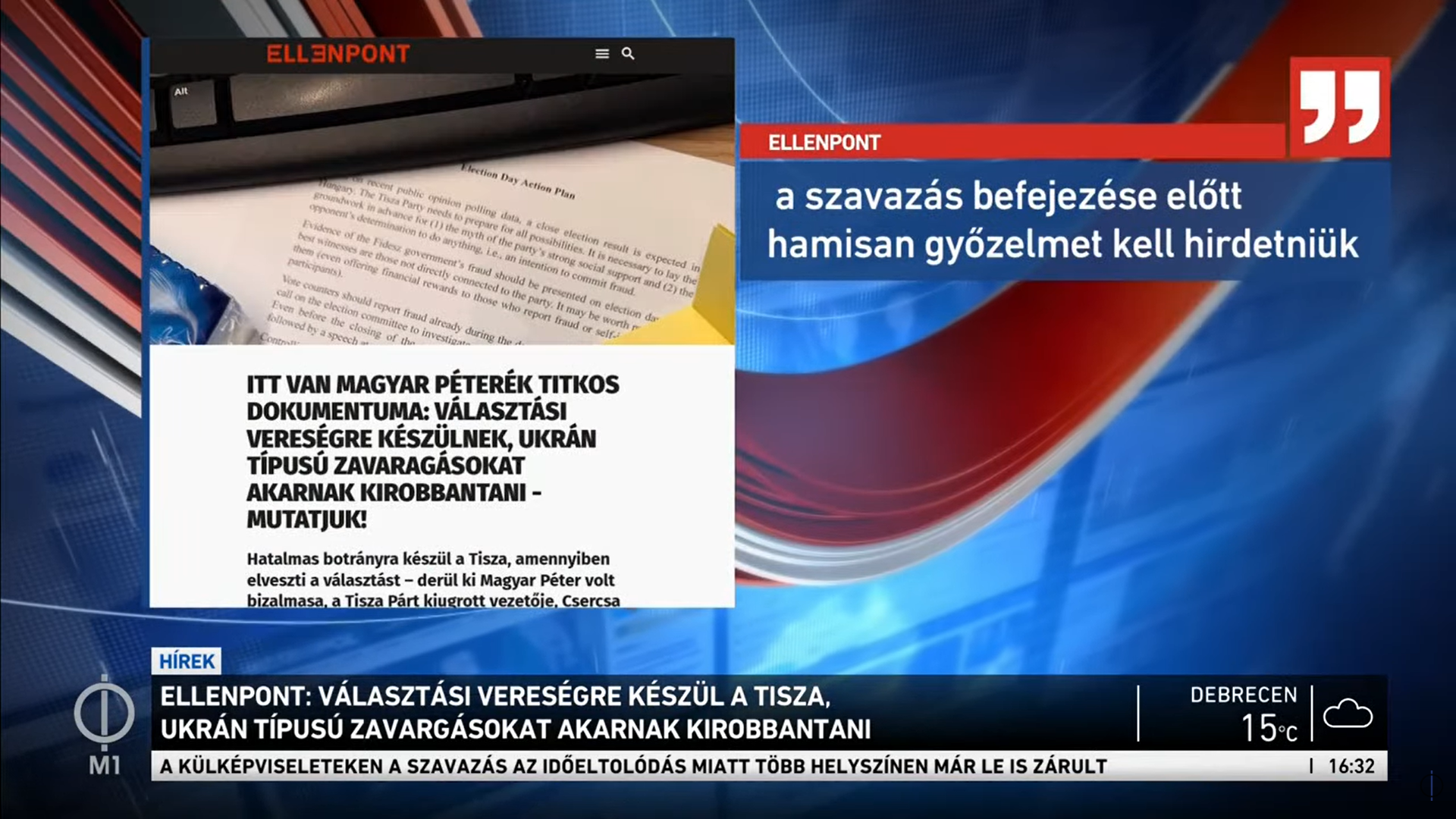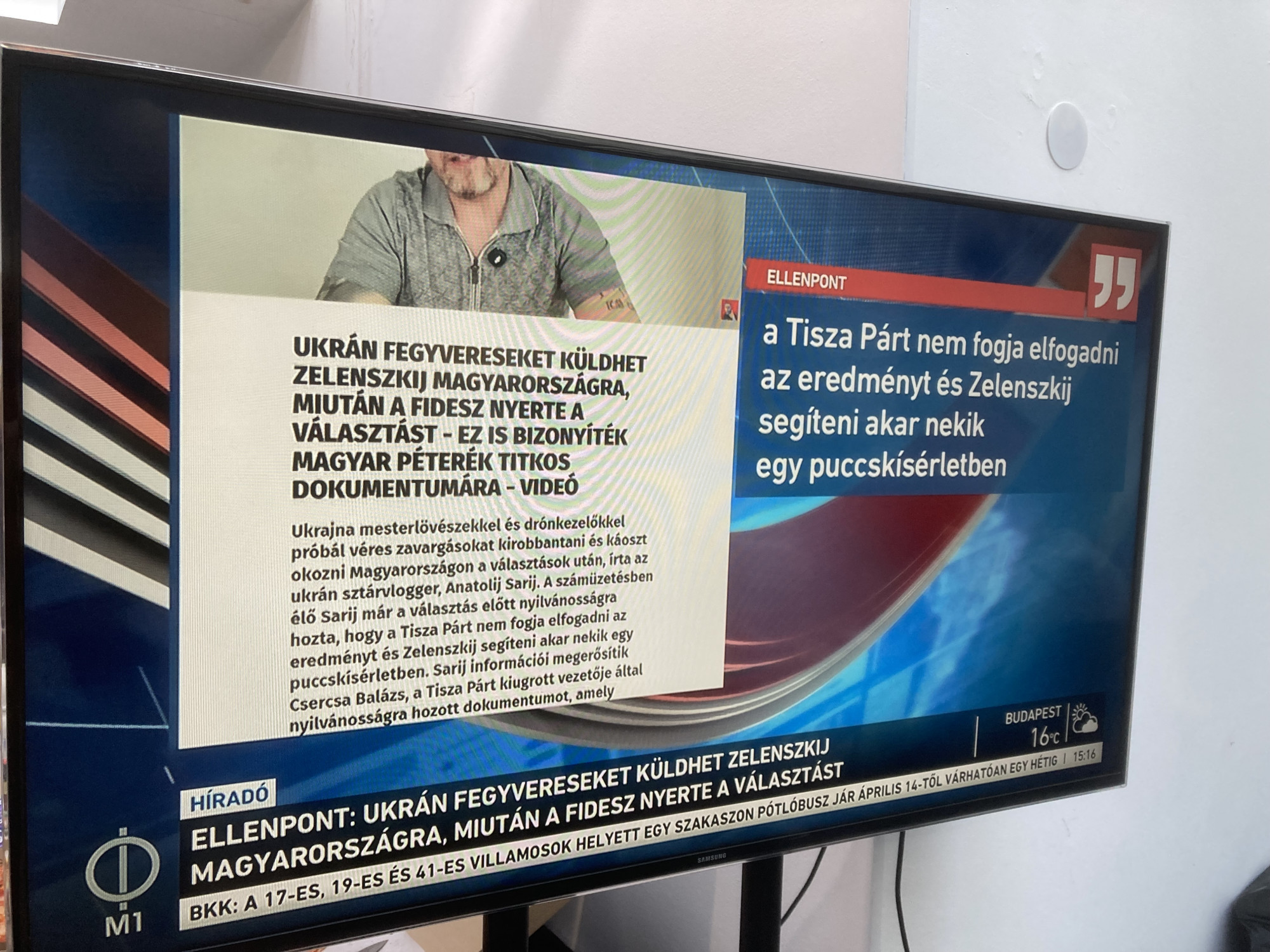hangzik az egyik végtelenségig ismételt bejátszás. Egy ukrán blogger semmivel nem alátámasztott videója alapján közlik, hogy „fegyveres zavargásokat akar kirobbantani Volodimir Zelenszkij Magyarországon”. Egy szakértő meg egyenesen arról értekezett, hogy kiskorúakat ne engedjünk ki az utcára vasárnap, mert az ukránok nem nézik, ki mennyi idős. Az is elhangzik, hogy a Majdanhoz hasonló színes forradalom lenne itt, ha a Tisza veszít. Ami azért vicces, mert az orosz Meduza korábban arról írt, hogy egy Kremlnek dolgozó politikai tanácsadó szerint Orbán veresége esetén az állami irányítású orosz média ezt az Európai Unió által szervezett „színes forradalomnak” fogja beállítani.