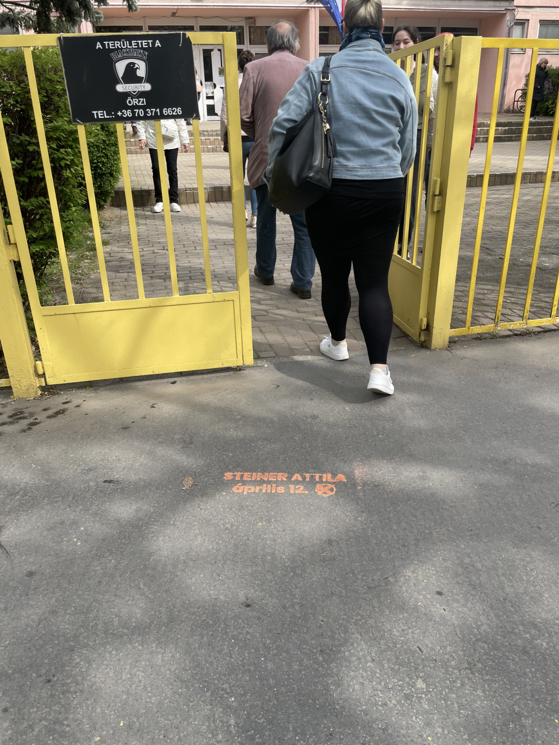 Ugyancsak Budapestről, a 3. számú egyéni választókerületből is érkezett felvételt járdára fújt kampányfeliratról: itt az Őrmezei általános iskola előtt Steiner Attilát népszerűsítik: