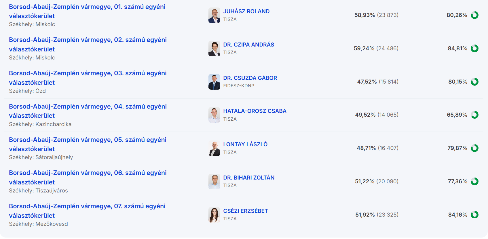 Borsod-Abaúj-Zemplén megye 7 választókerületéből 6-ban vezet a Tisza. Egy kivételével minden választókerületben 80 százalék körüli a feldolgozottság. Ezen a ponton csak Borsod 03-ban vezet a Fidesz: Csuzda Gábor jelenleg ezer szavazattal vezet a tiszás Németh Csilla előtt.