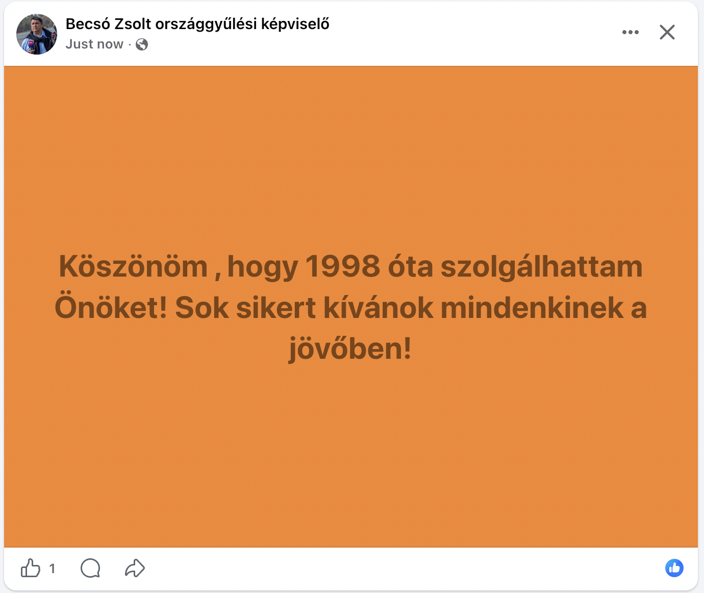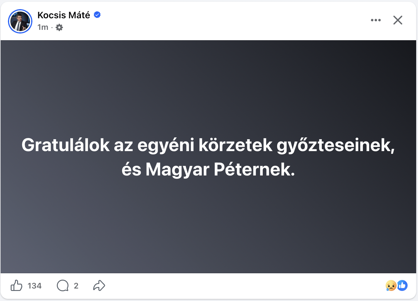 „Óriási győzelem, óriási felelősség! A nemzeti színű Lánchíddal üdvözöljük a reményt, hogy mostantól nem az életünk fog szólni a politikáról, hanem a politika az életünkről.”