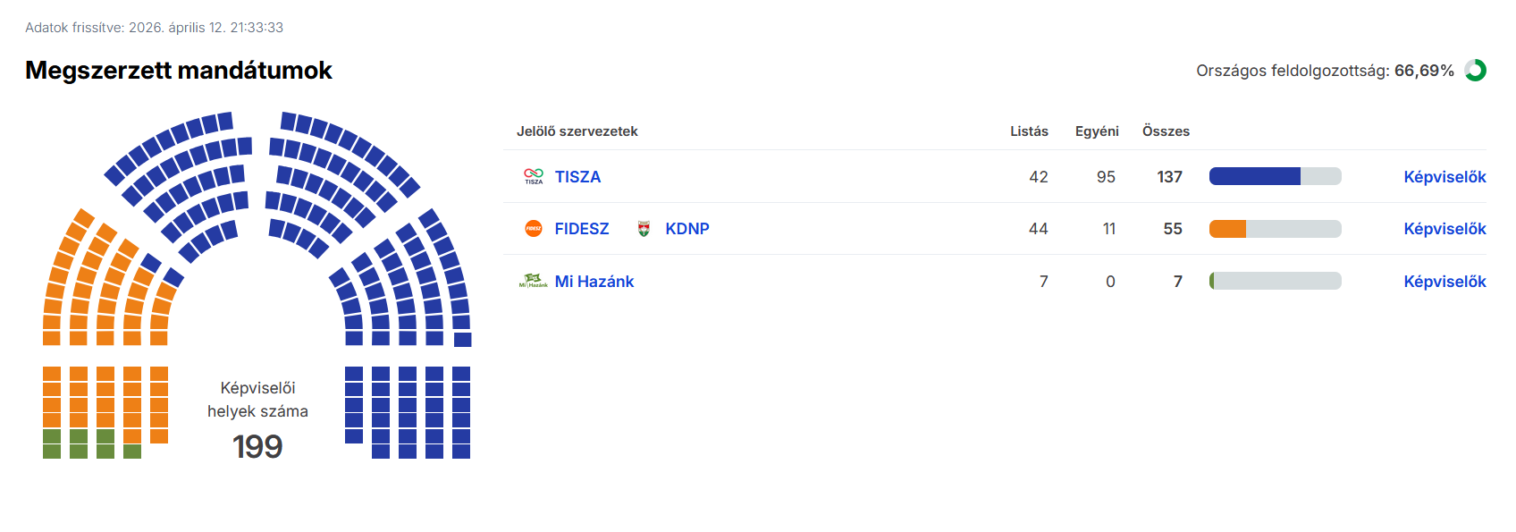 Egyéniben továbbra is 95 tiszás és 11 fideszes győzelmet számol az NVI adata, listán viszont újabb helyet vett el a Tisza a Fidesz-KDNP-től, ott most már csak 44:42 a fideszes előny. A Mi Hazánk tartja a 7 listás mandátumát. A feldolgozottság 66,69 százalékos.