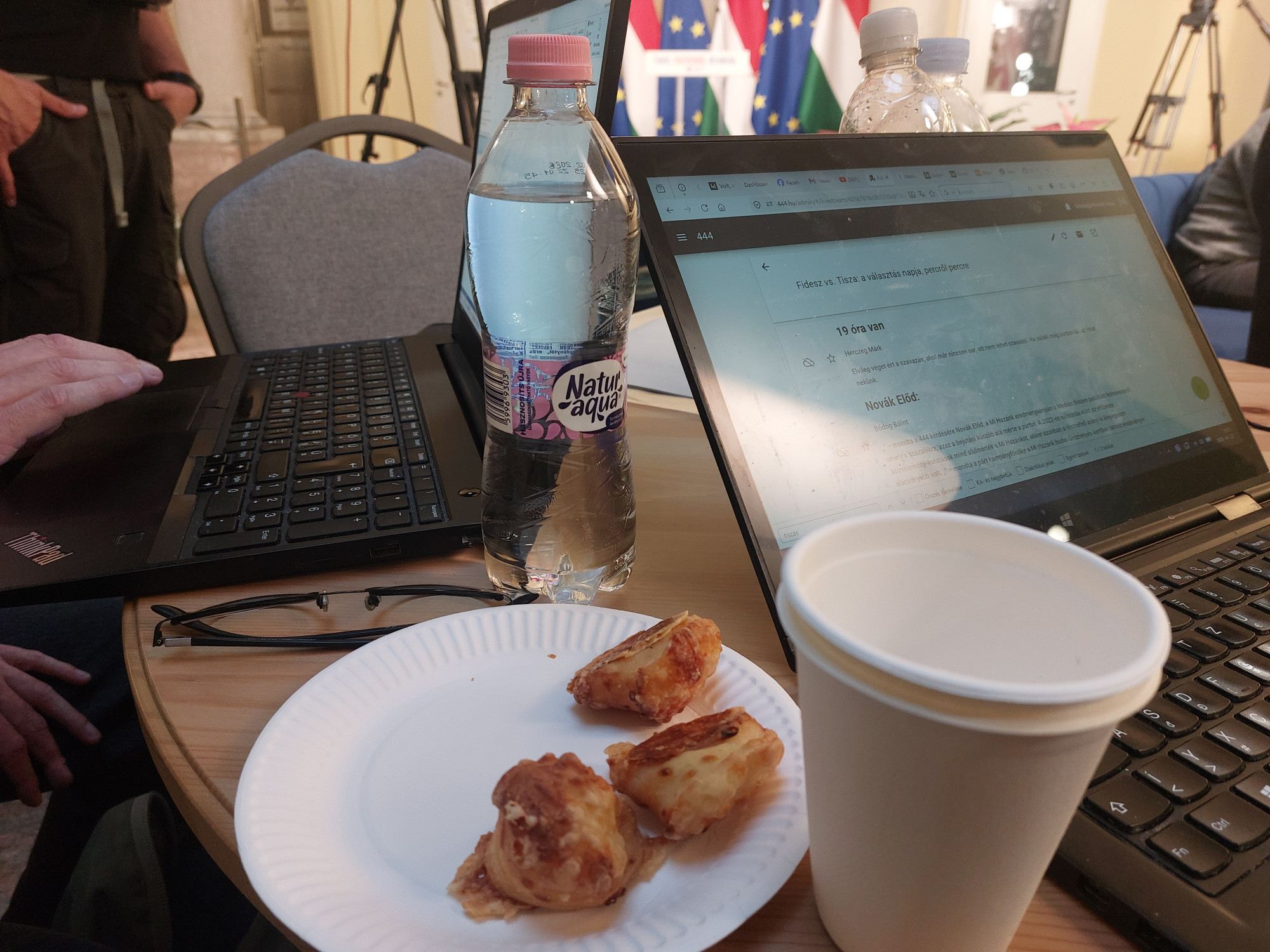A Tisza Párt hivatalos eredményváróját a Novotel szállóban tartja. Sokan vannak: a belföldi újságírók bent a hotel aljában, a külföldiek a Psota Irén utcában felállított nagy sátorban. Aki tiszással találkoztam, remek hangulatban van.