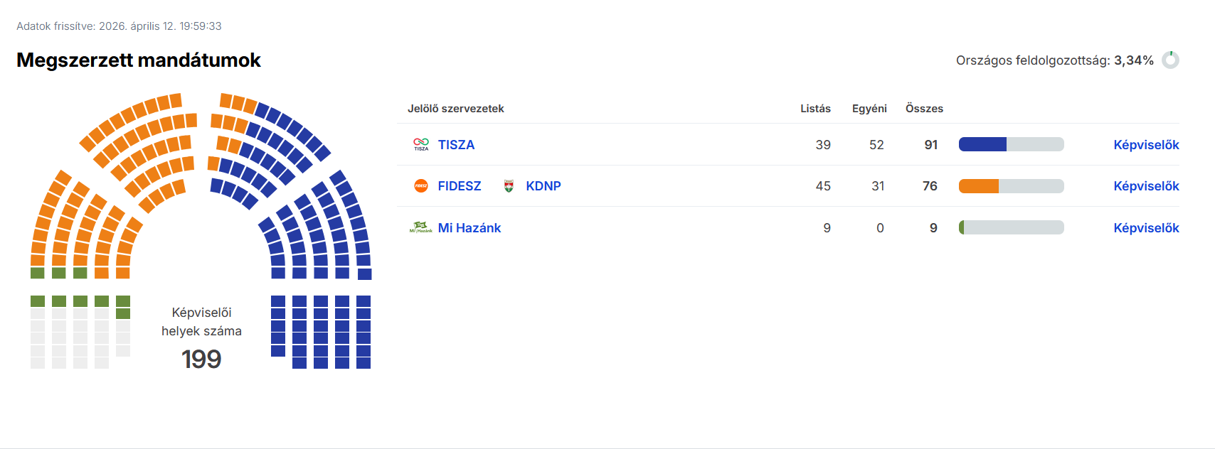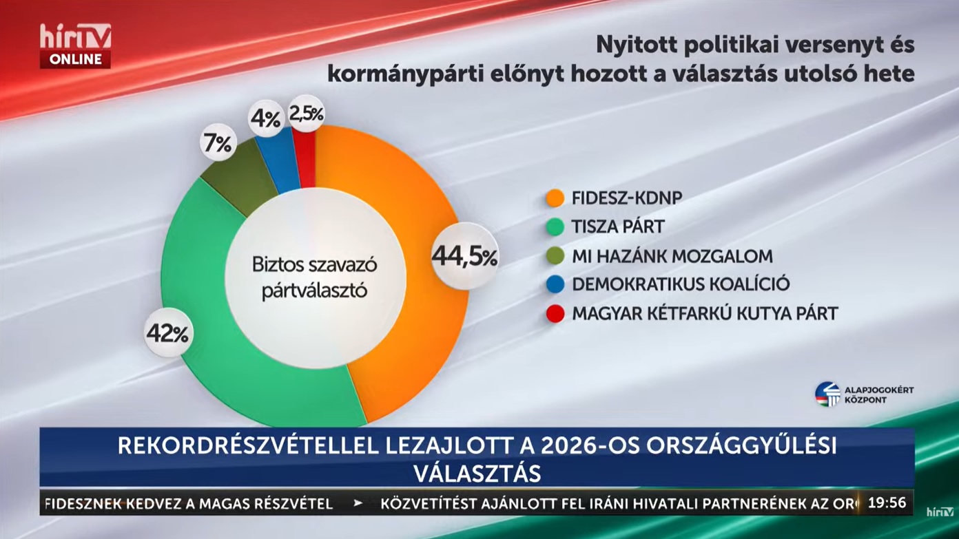 A legfrissebb közvéleménykutatások alapján számított választási barométer alapján 82 százalék esély van arra, hogy a Tisza nyerte a választást. A Tisza kétharmadnak 29,7 százalékot adnak. A Fidesz győzelmére 15,3 százalék, a Fidesz kétharmadra pedig 1,3 százalék esélyt látnak. (Partizán)