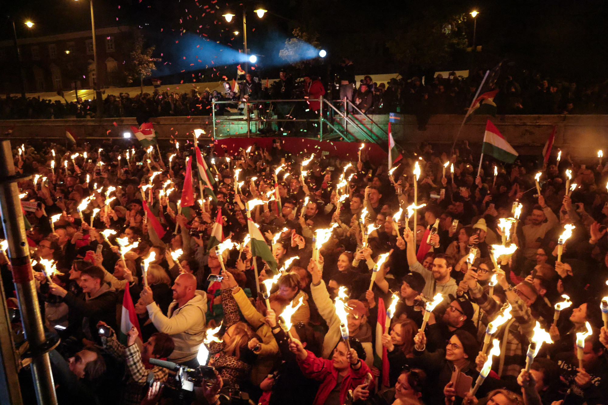 Amikor felért a színpadra, volt egy rövid tűzijáték, a tömeg pedig azt kiabálta, hogy árad a Tisza. Magyar mellett állt végig a párt vezetősége.