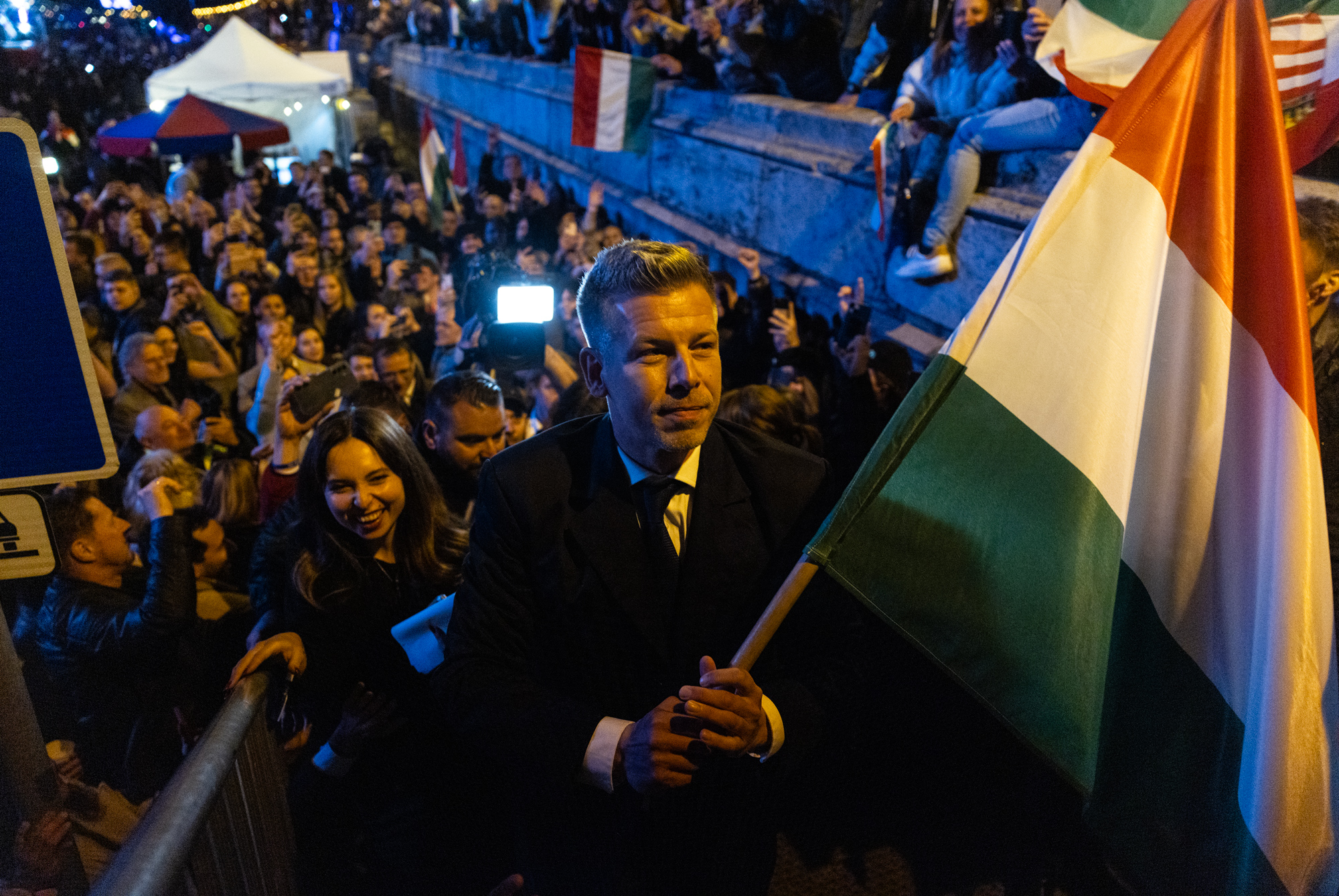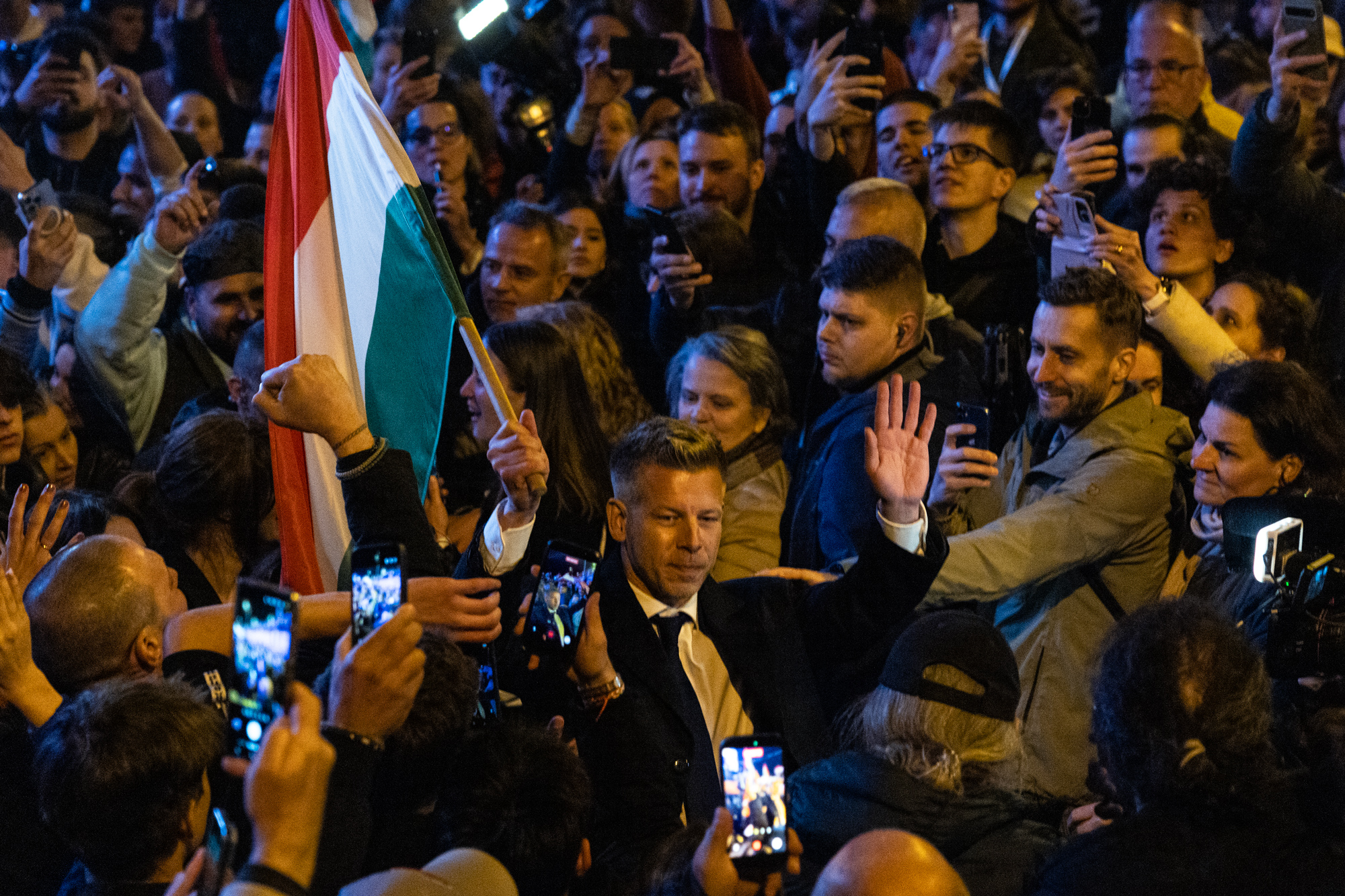 Magyar és a párt vezetői percekig vonult a tömegben, zászlót lengetve. A tiszások folyamatosan kiabáltak, fütyültek, ria-ria Hungáriáztak, szép volt Peti-t kiabáltak, gratuláltak és köszönetet mondtak neki.